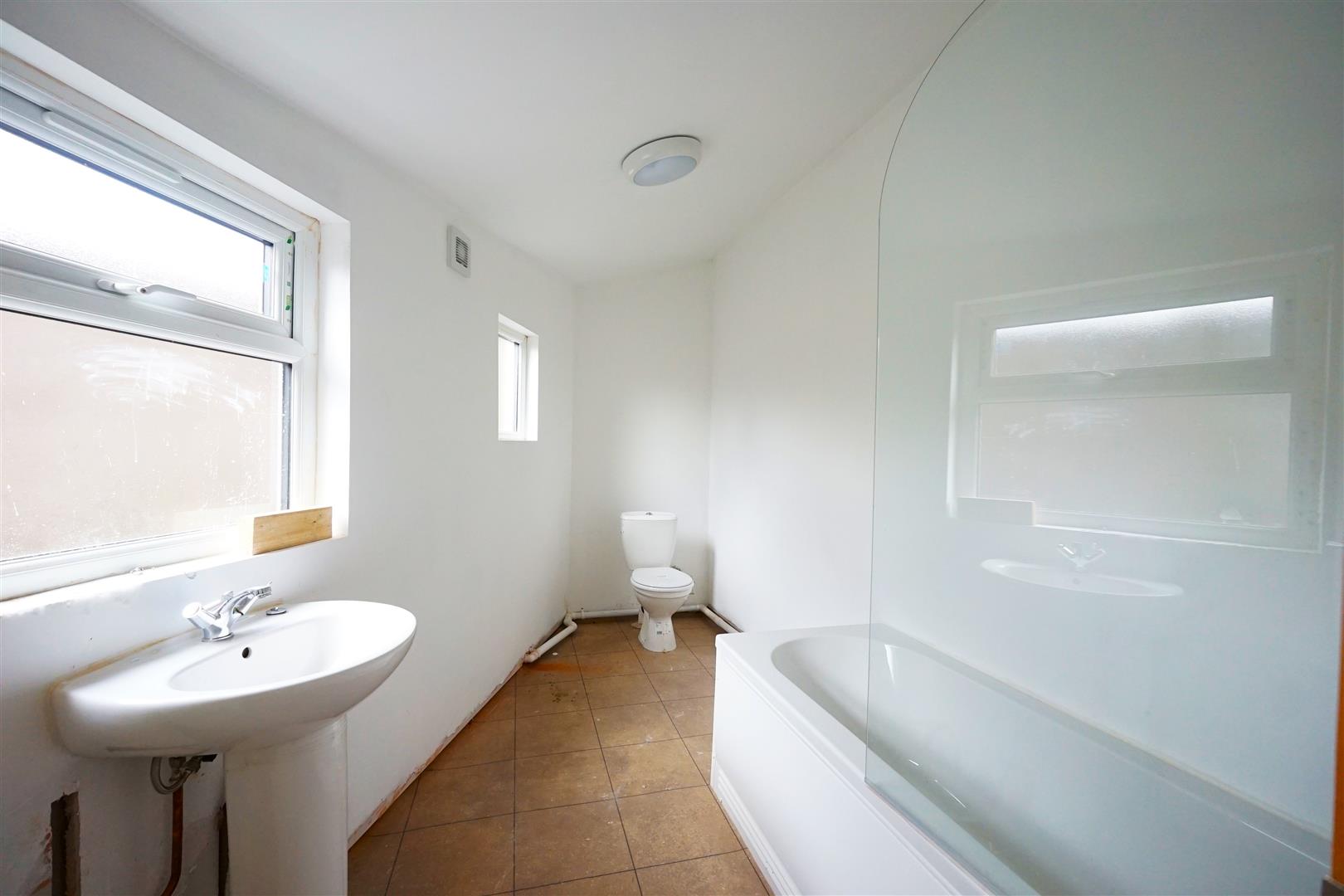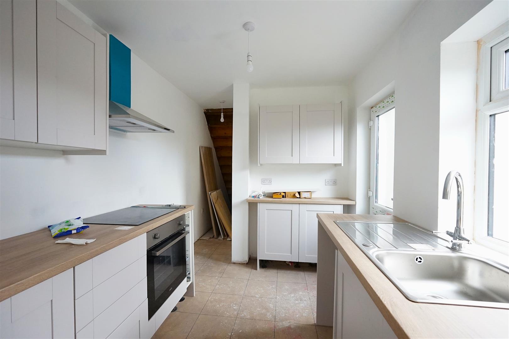 The dining area leads through to the kitchen, where a range of wall and base units have been installed, although some finishing touches are still required—offering an excellent opportunity for buyers to personalise the space. From here, there is a new uPVC door providing access to the rear yard. Also on the ground floor is a bathroom fitted with a bath, WC, and hand basin.
