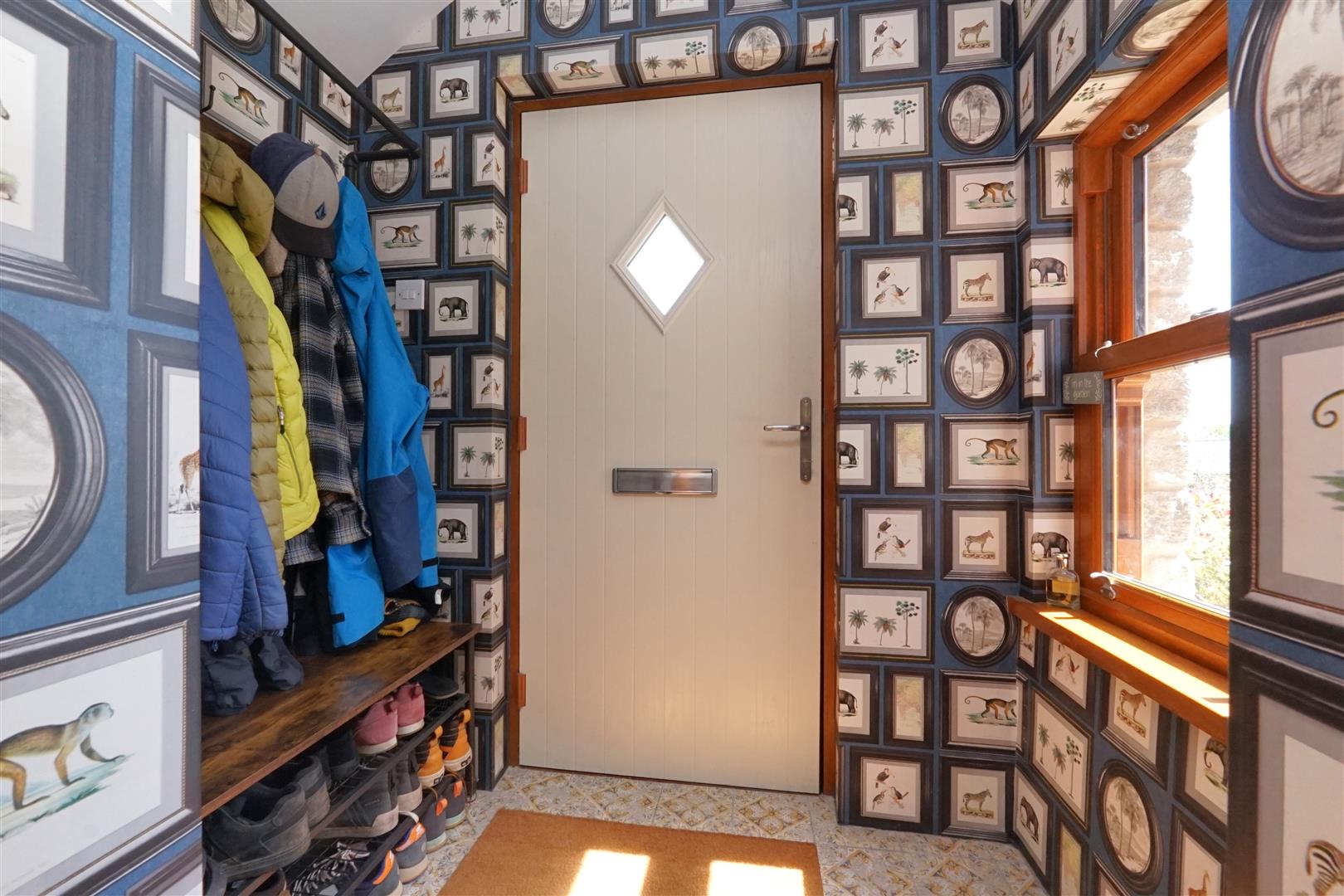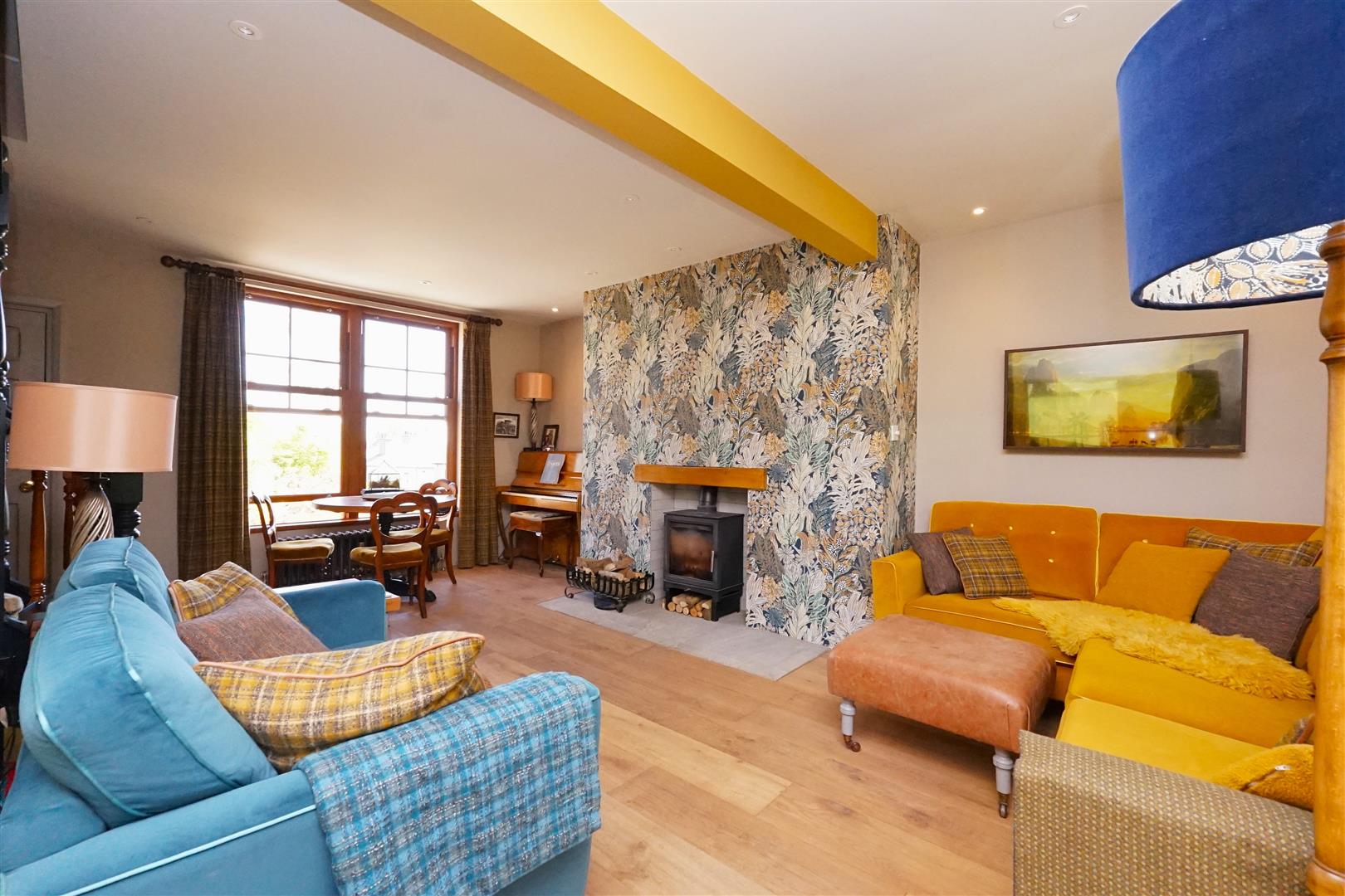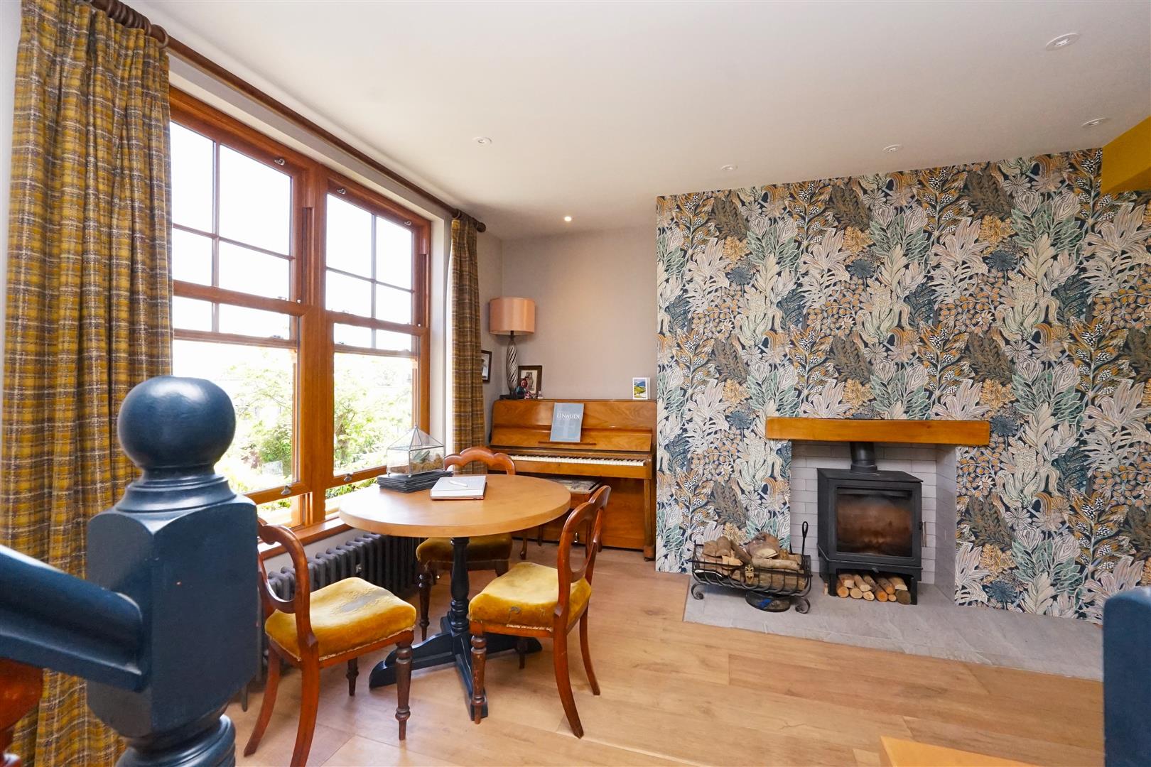 Step through the entrance porch, a welcoming space complete with vibrant décor and a practical area for coats and shoes. The porch leads directly into the heart of the home — a stunning lounge that immediately impresses with its superb presentation. This dual-aspect room is bathed in natural light, thanks to the double-glazed sash windows and wide double patio doors that open directly onto the tiered garden. Beautiful wooden floors and a wood-burning stove add warmth and character, making this a cosy yet elegant living space. From here, there's direct access to both the kitchen and the stairs to the upper floor.