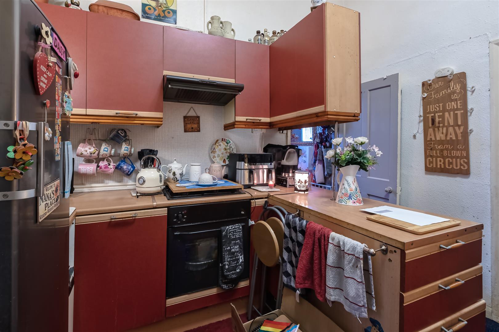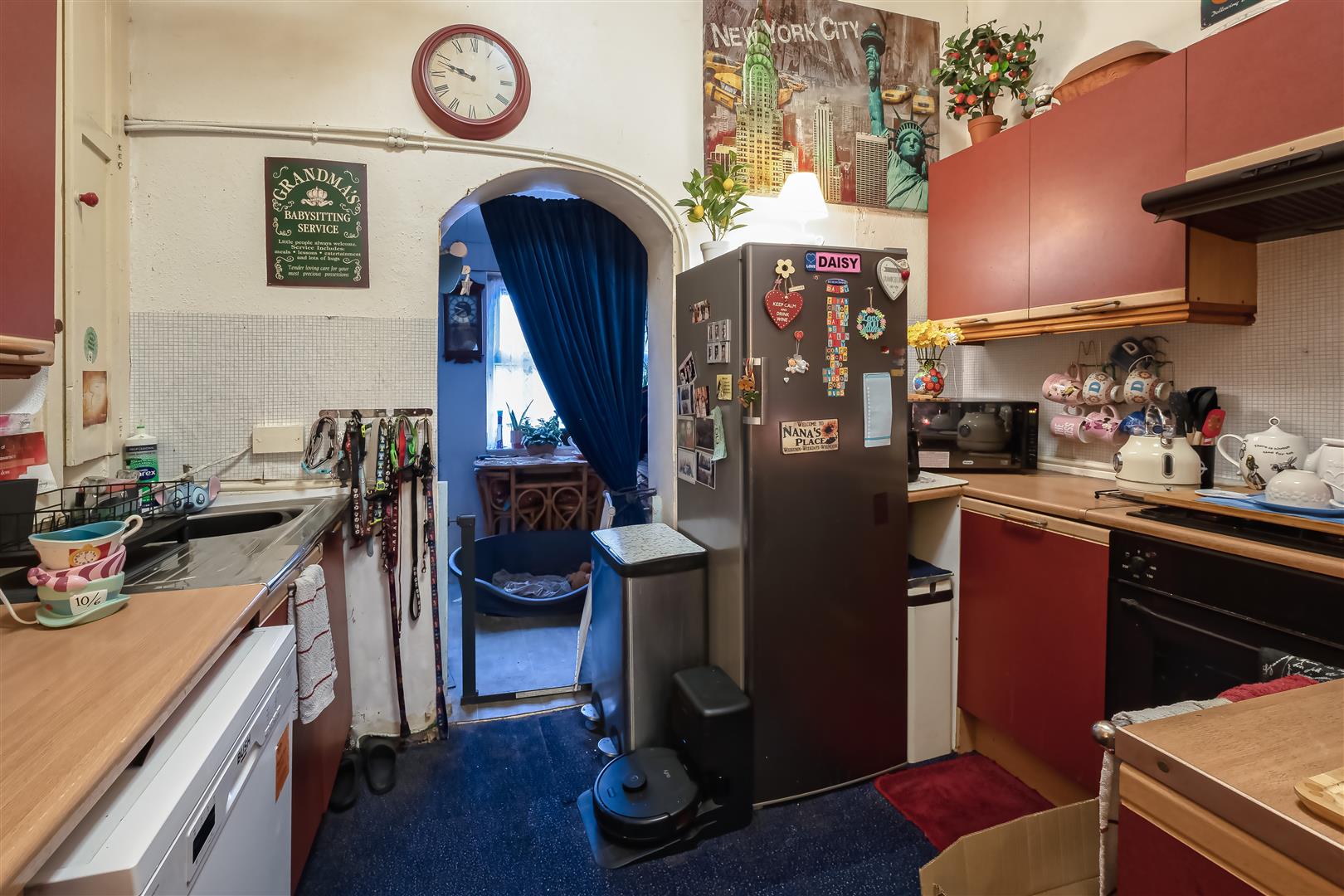 Leading through to the kitchen, you will find a range of wall and base units offering ample storage, along with a laminated worktop. The kitchen provides space for a freestanding fridge/freezer and is currently equipped with a four-ring gas hob.