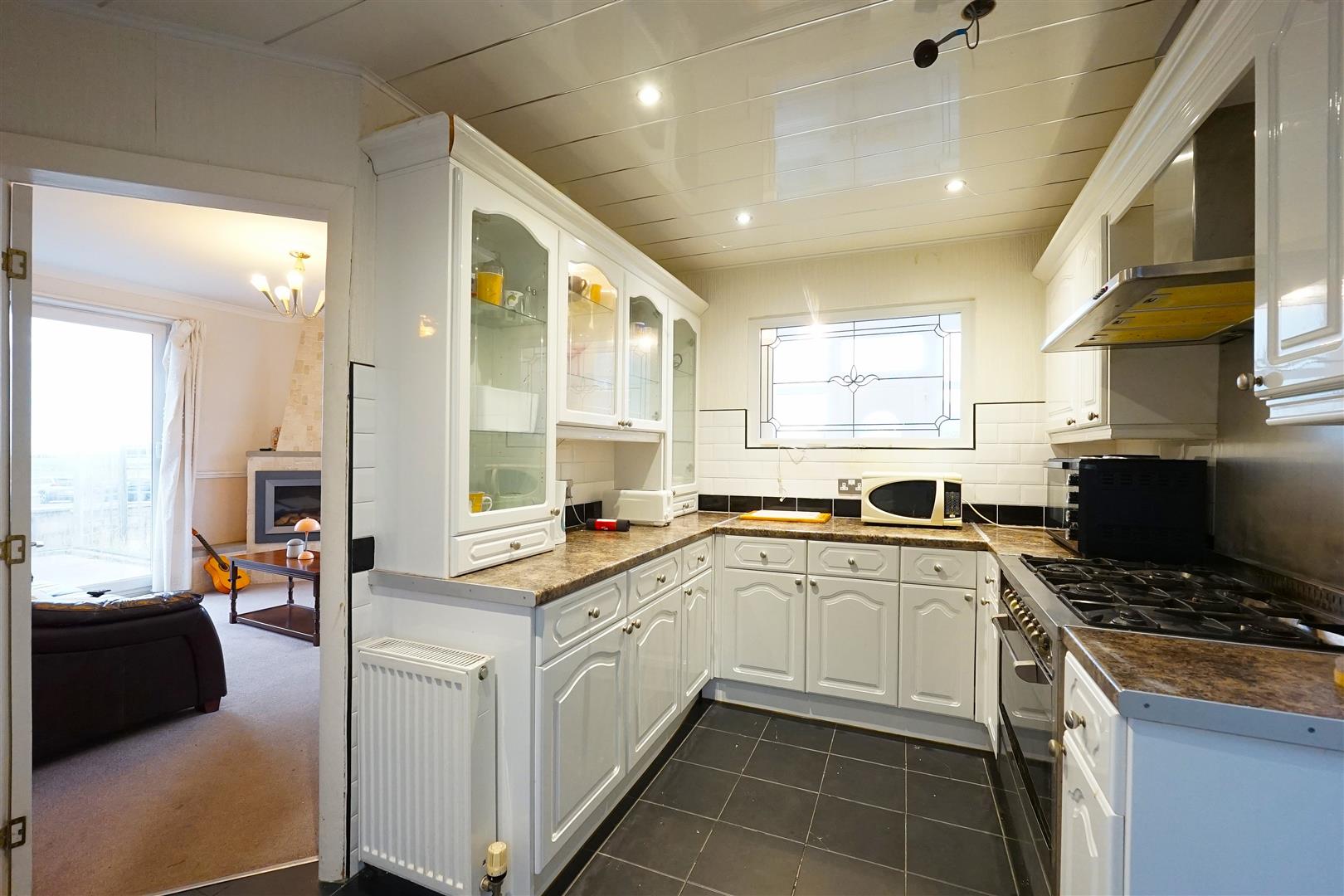 The kitchen is a great size and fitted with traditional white wall and base units, offering plenty of storage. Laminate worktops provide generous preparation space, and the kitchen includes a large range cooker, with room for a freestanding fridge freezer.