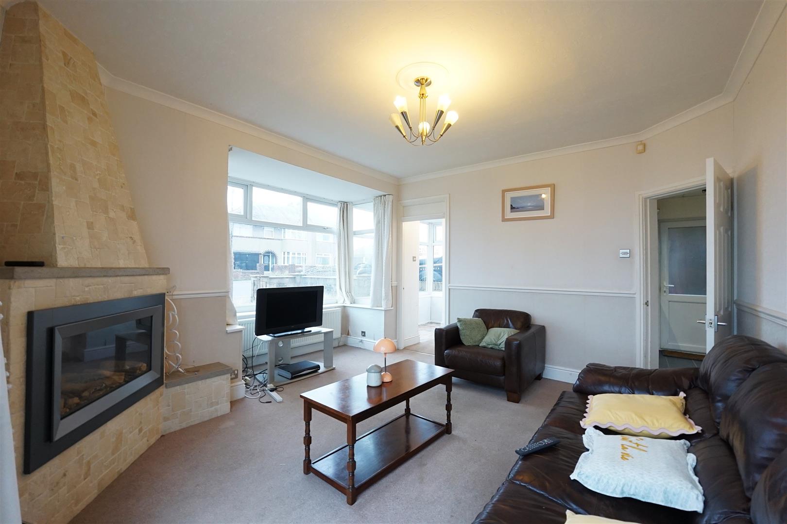 Upon entering the property, you are welcomed into a generously sized entrance hall, offering ample space for coats and shoes. Leading through to the reception room, this is a bright and well-proportioned space, benefitting from an abundance of windows that allow plenty of natural light to flow through. Sliding doors provide direct access to the garden, creating a lovely connection between indoor and outdoor living. The focal point of the room is a large gas fire with an attractive stone-effect surround. The room is tastefully decorated with cream walls and a matching cream carpet.