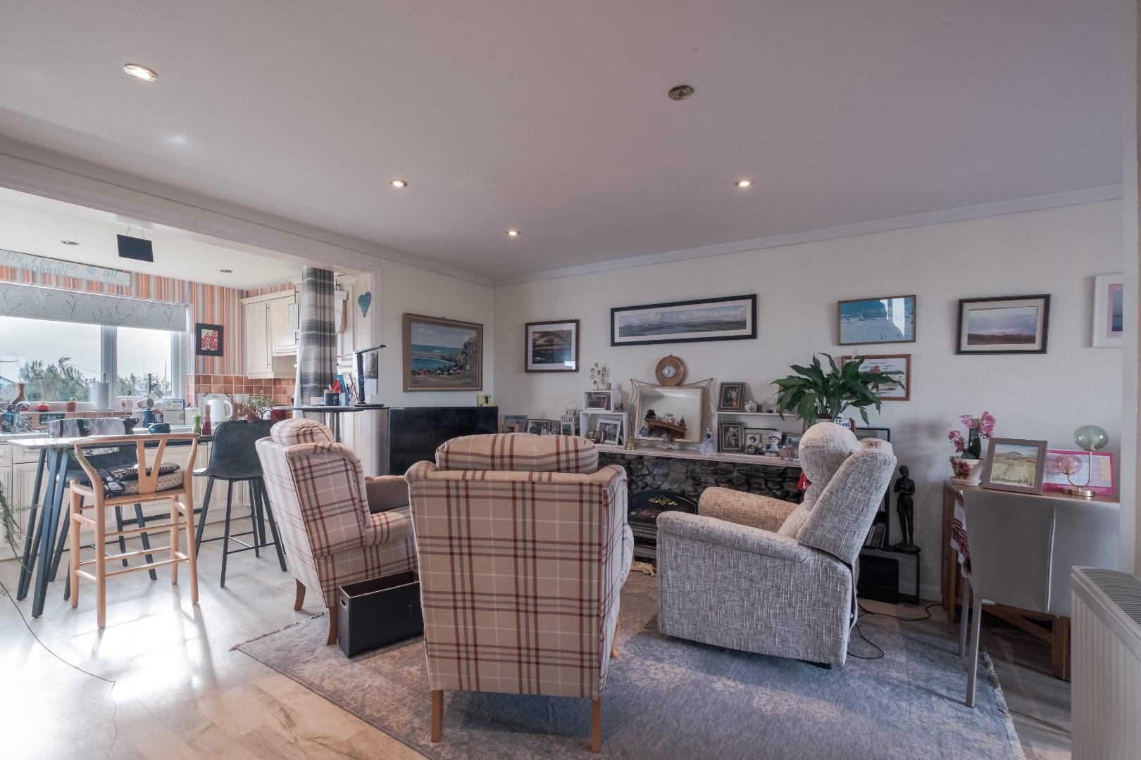 The front door opens directly into the kitchen, which is fitted with a range of base and wall units and incorporates a gas hob and double electric fan oven, with ample worktop space for everyday cooking. The kitchen forms part of the open-plan kitchen and lounge, which runs from the front through to the rear of the property, creating a bright and spacious living environment. The lounge area provides plenty of space for seating and dining, ideal for both relaxing and entertaining.
