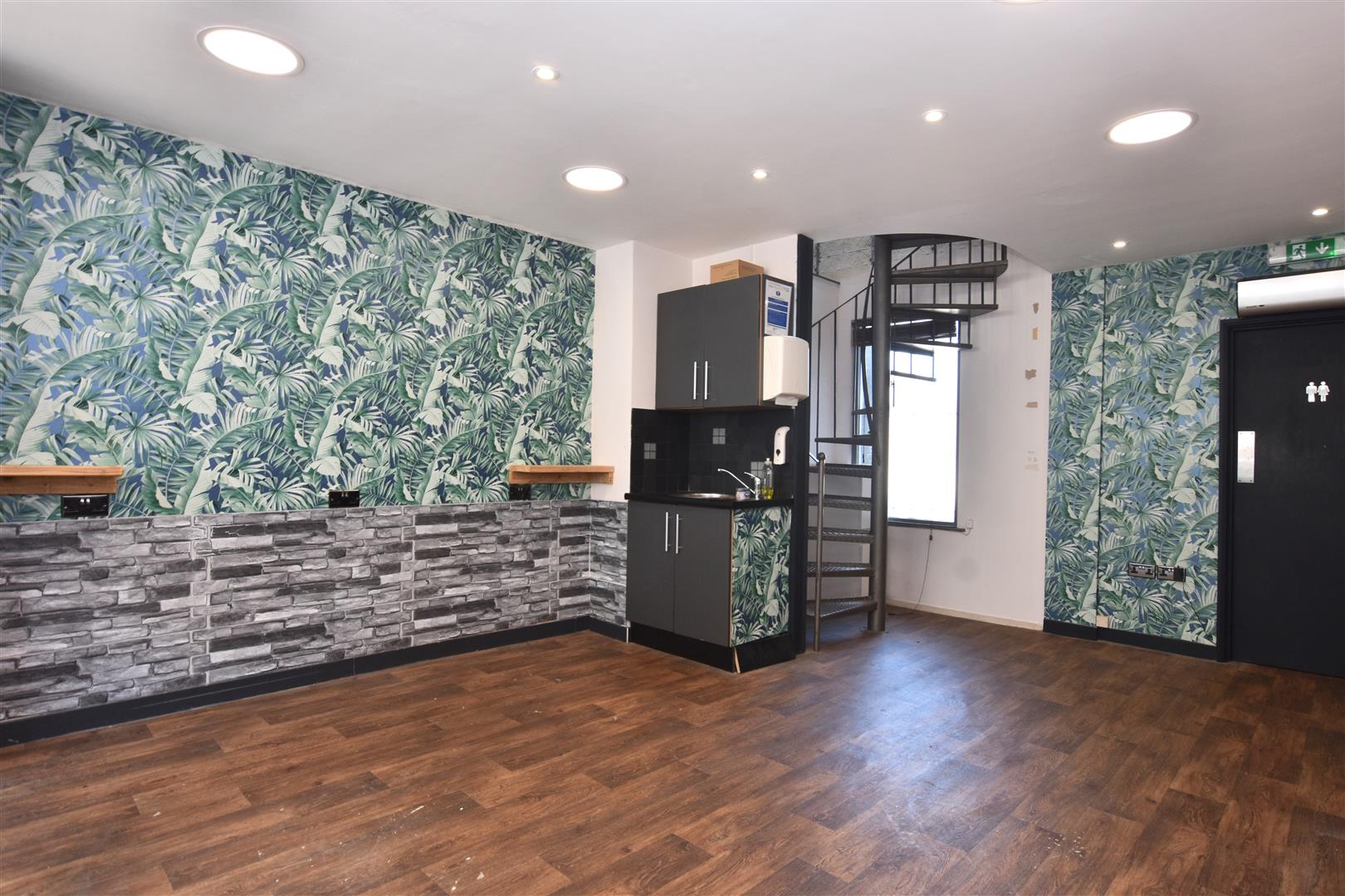 Upon entering the the shop you will find a reception desk and spiral staircase which climbs up to the first floor. There is an impressive double height space with balcony allowing plenty of natural light in. The floors have been fitted with herringbone LVT flooring and the ceilings with recessed spotlighting. The walls have been finished with tasteful and modern accents which gives the shop personality and warmth. To the rear of the ground floor is a small kitchenette with storage and a sink.
