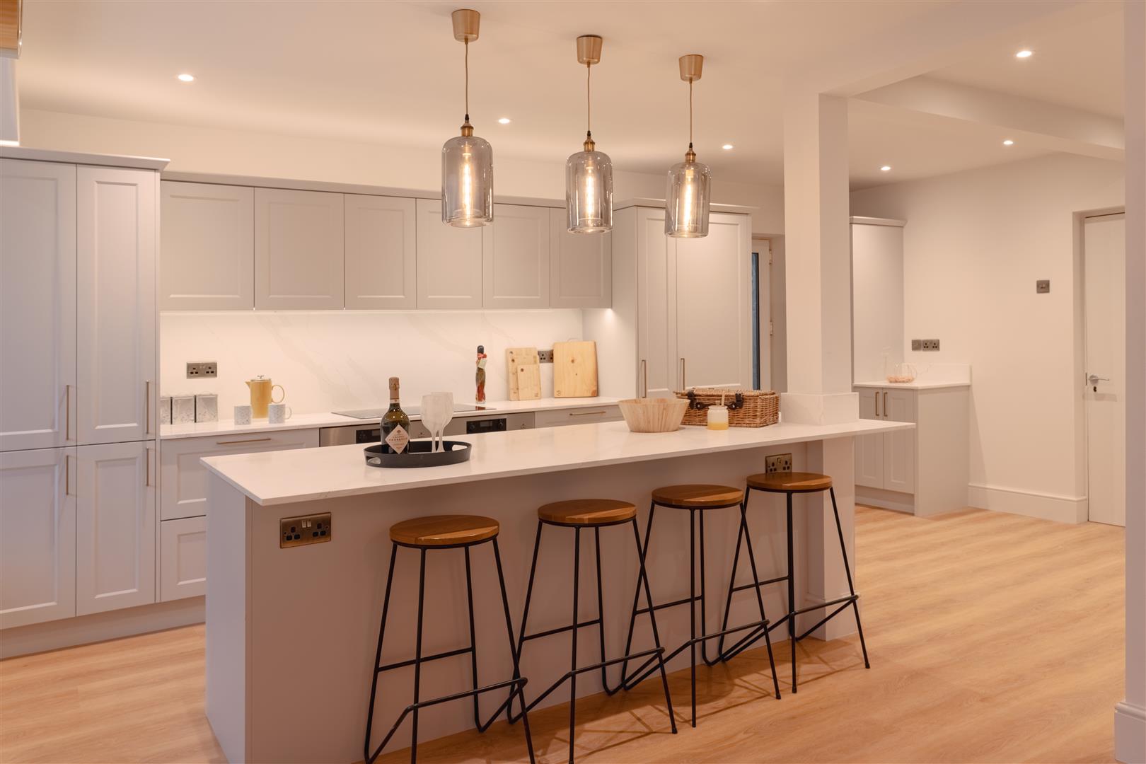 The kitchen boasts a large, central island with beautiful quartz worktops, providing both a functional workspace and a stylish focal point. The island serves as a gathering place for family and guests while offering ample room for food prep or casual meals. The kitchen is fully equipped with appliances, including a dishwasher, an induction hob, and an integrated fridge, alongside many other modern conveniences to make daily living more efficient. The white shaker-style kitchen units, complimented by gold hardware, create a timeless and elegant look that feels both contemporary and classic. You can gain access into the garage from here.