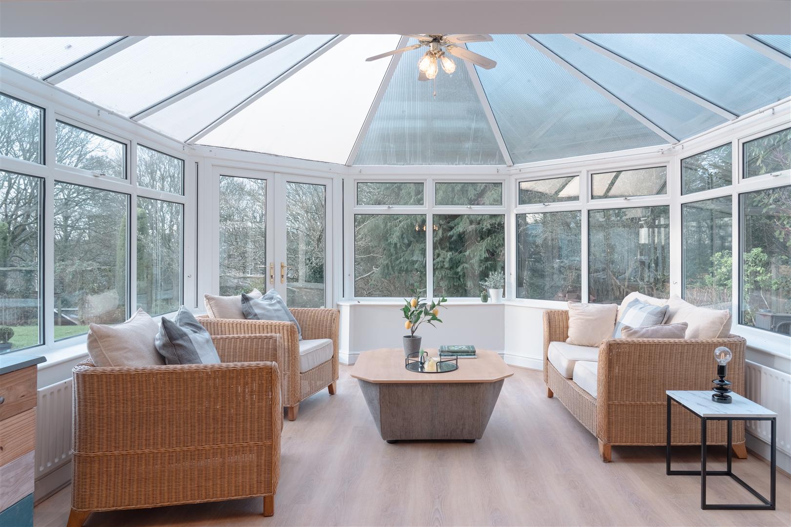 The conservatory offers stunning woodland views that provide a sense of tranquillity. Large windows on all sides ensure that the space is flooded with natural light, making it the perfect spot to relax. With the neutral walls and wood flooring that continues from the living areas, the conservatory feels like an extension of the open-plan space, blending seamlessly with the rest of the home.