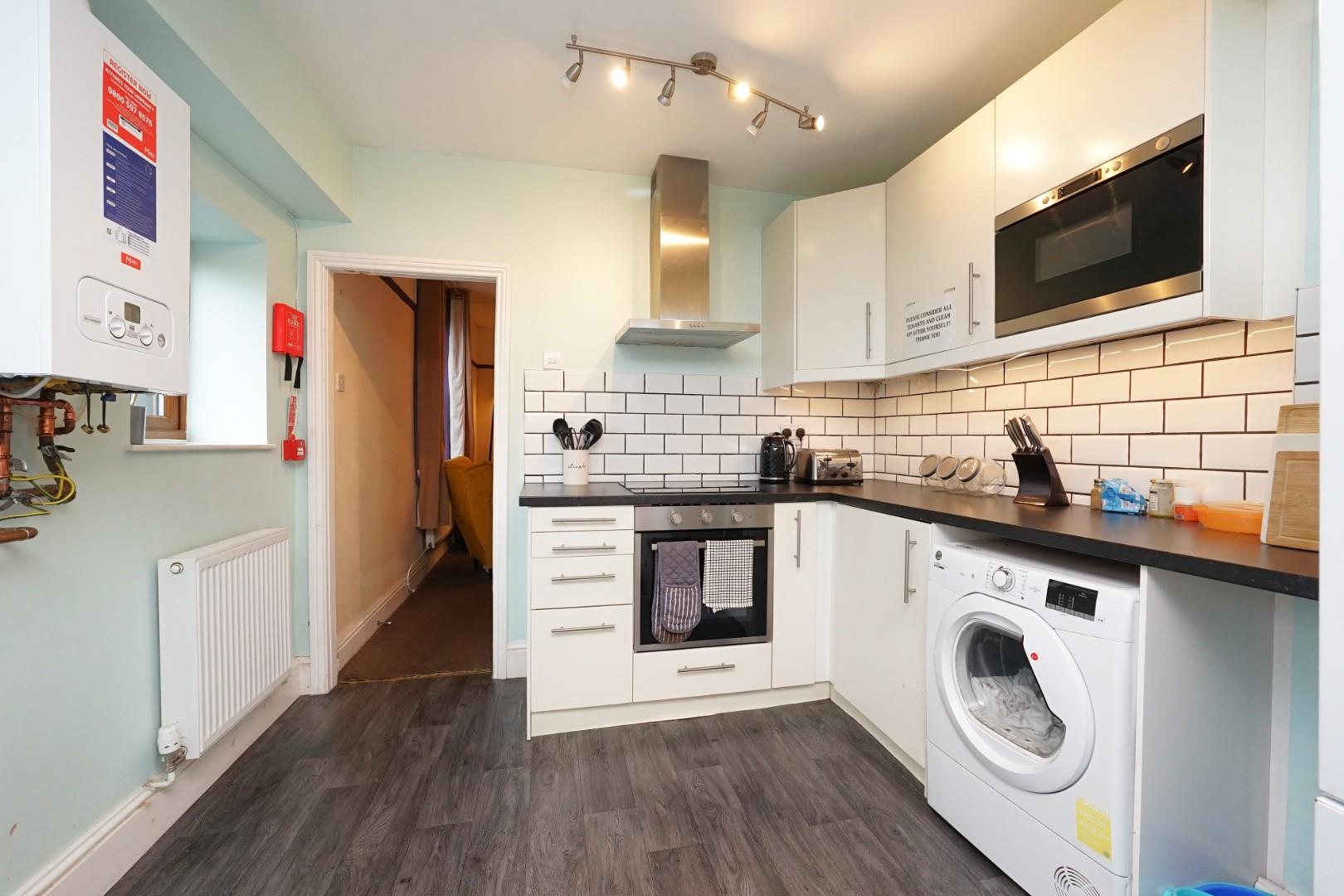 Upon entering the property through the double-glazed front door, you are welcomed into a hallway with tiled flooring, providing access to Bedrooms 1 and 2 on the ground floor, as well as the lounge, staircase, and kitchen. The lounge features a wall-mounted electric fire and leads directly into the kitchen. The kitchen is fitted with a range of white base and wall units, complemented by grey laminate work surfaces. It also benefits from an electric induction hob, electric oven, built-in microwave, and plumbing for a washing machine.