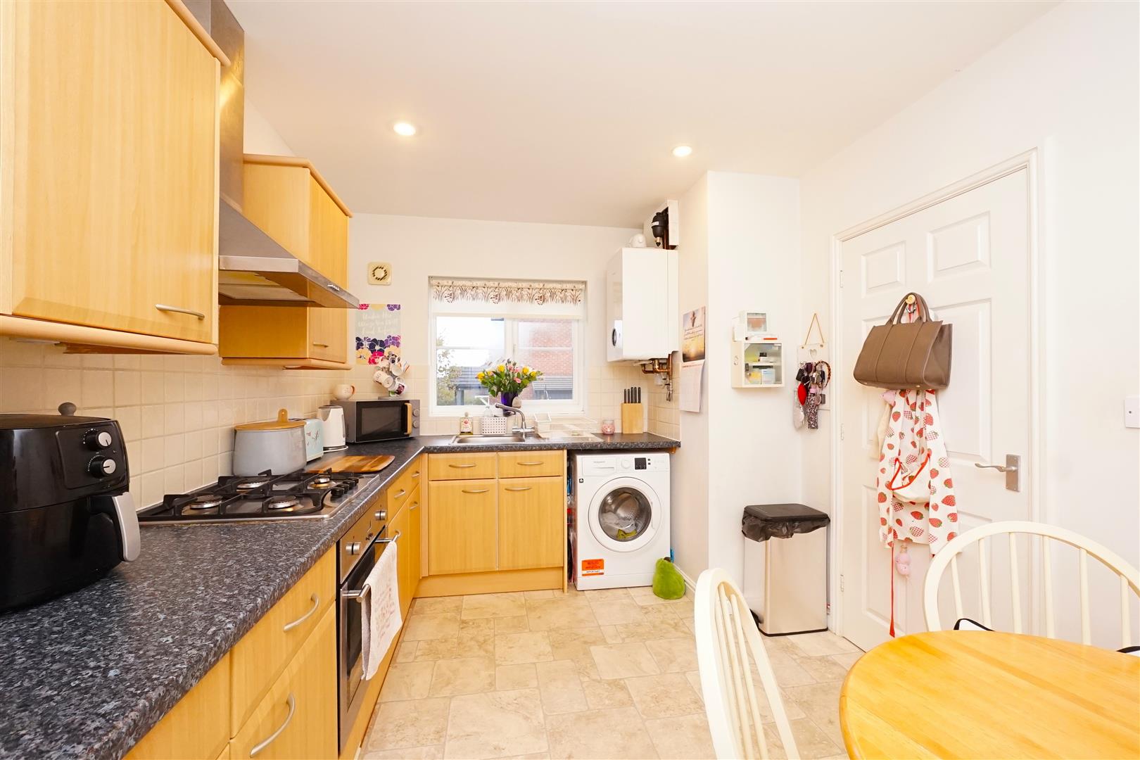 Upon approach, you’re greeted by a maintained front garden and a driveway that leads up to the garage, offering both charm and convenience. Stepping through the front door, you enter the main hallway, where wood laminate flooring flows into the lounge and conservatory. Immediately to the left is a neat and practical downstairs toilet, ideal for guests or busy family life. To the right, the kitchen features ample cupboard and worktop space, along with connections for all essential appliances — a perfect space for cooking and everyday dining.