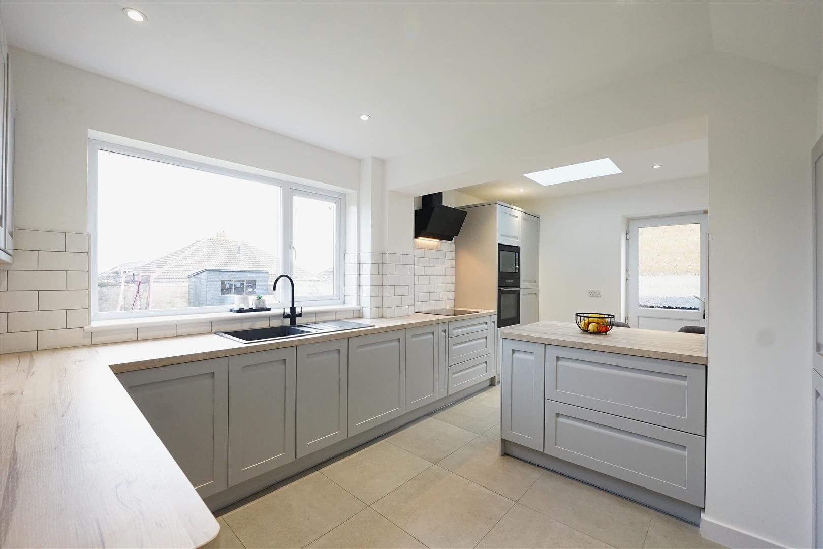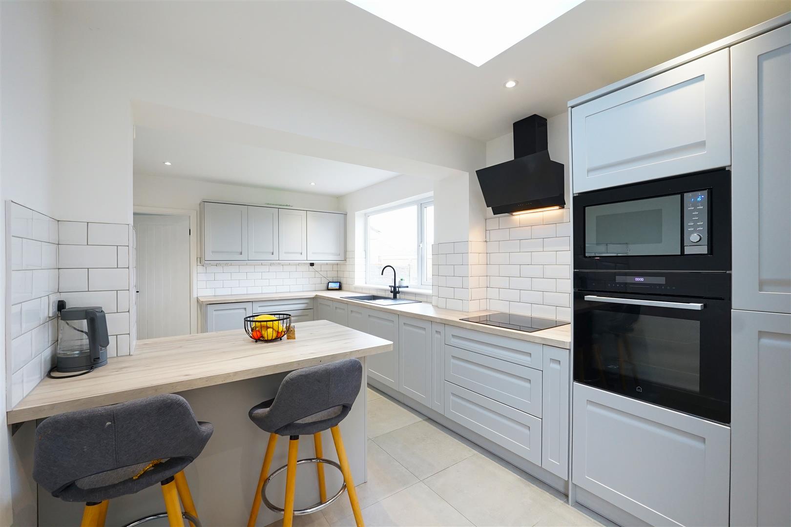 Upon entering the home through the entrance hall, you're immediately greeted with an open and airy atmosphere, decorated with laminate flooring leading through to the reception room. Into the reception room, you will find a comfortable space perfect for relaxing, boasting generous sized windows allowing the space to be filled with natural light, giving it a warm and welcoming feel. The walls have been stylishly panelled, and the décor flows seamlessly through leading into the dining area. The kitchen area can be accessed through the dining area or straight from the entrance hallway, and has been fitted with modern wall and base units, offering ample counter space with wood effect laminate worksurfaces. The units are a shaker style design in light grey, with a complimentary white subway tile splashback and the floors have been tiled neutrally. It is well-equipped with integrated appliances such as a fridge/freezer, dishwasher electric hob, single oven, and microwave, as well as a breakfast bar seating area.