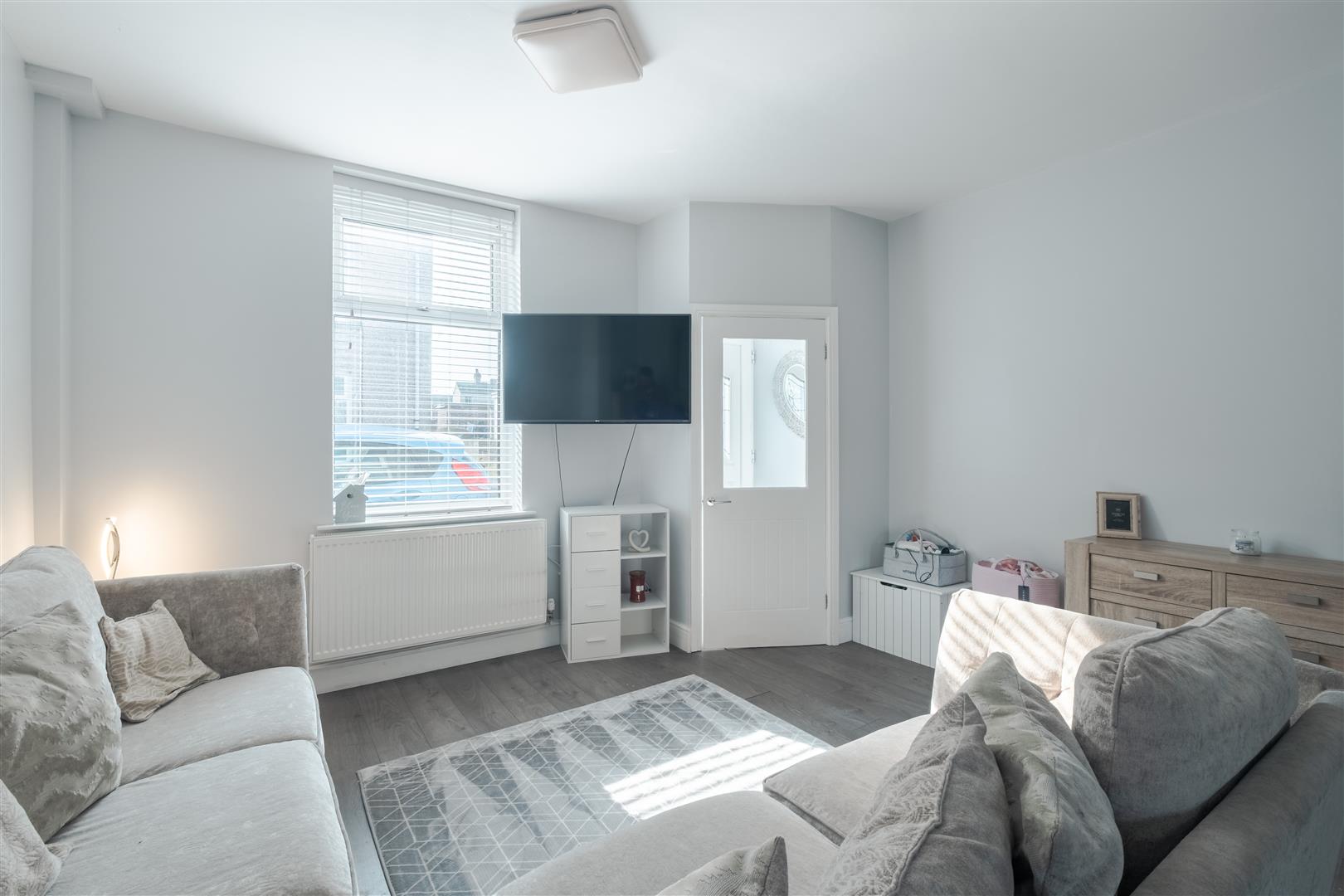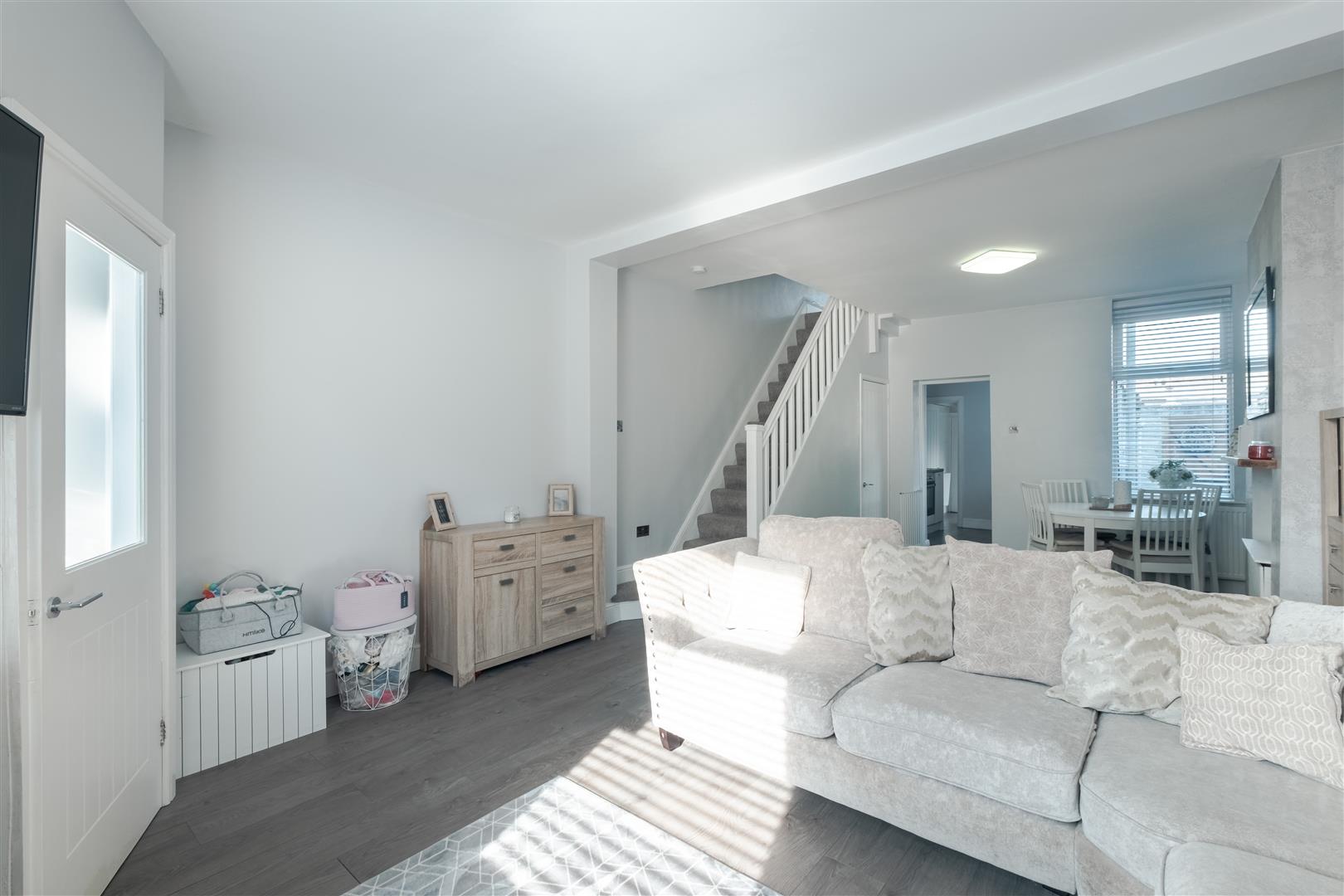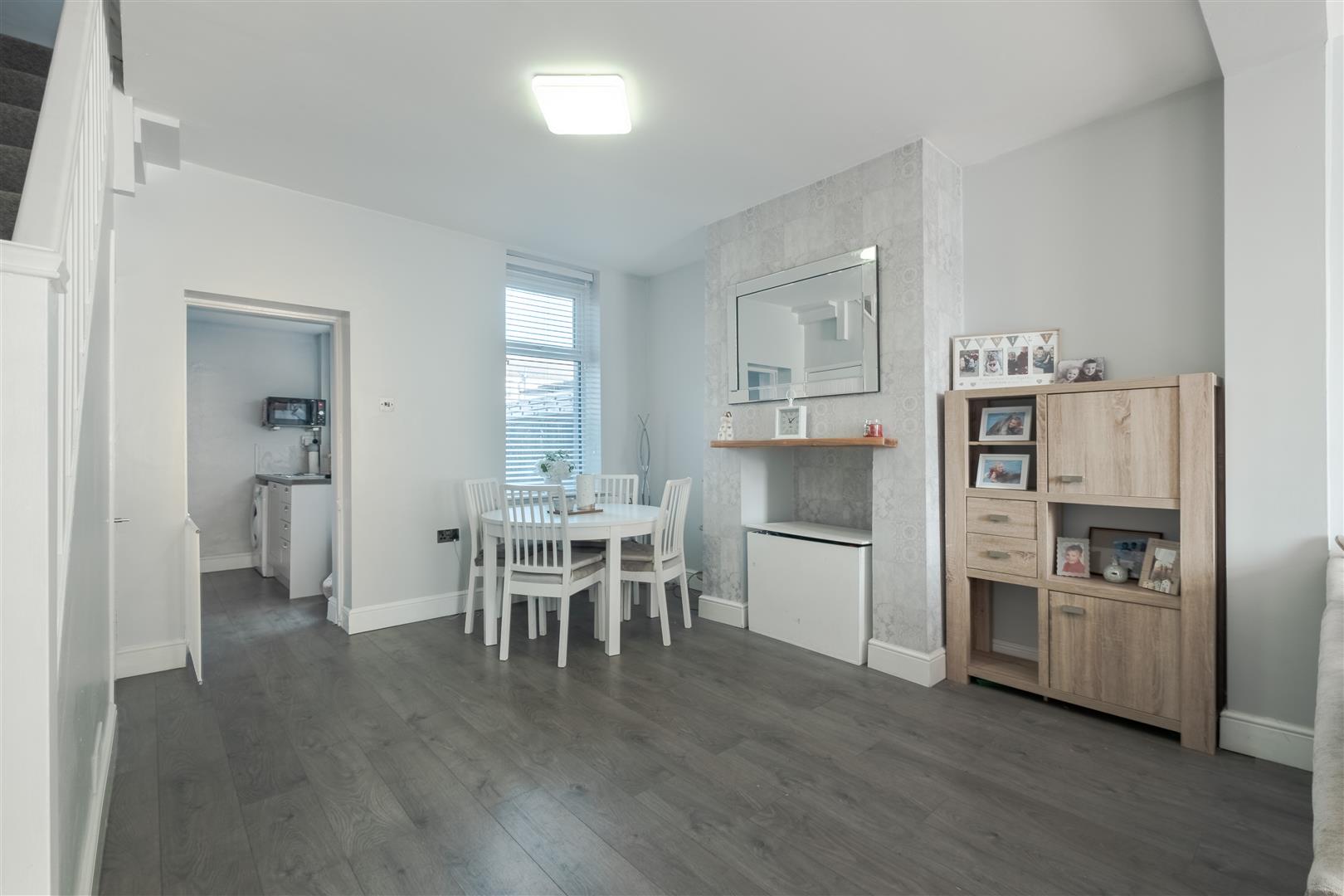 As you enter through the white uPVC front door, you are welcomed into a convenient entrance porch. Through the internal door is the open-plan lounge/diner, featuring windows to both the front and rear aspects, allowing plenty of natural light to flow through the space. The room is decorated with white walls and grey wood-effect flooring, with open access to the staircase leading to the first floor and ample space for a dining table.