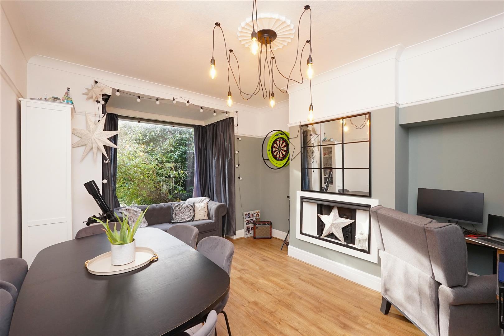 An entrance vestibule leads into a welcoming hallway, providing access to both reception rooms and the kitchen. The first reception room features a charming bow window, coving, and neutral décor, creating a light and airy atmosphere. The second reception room, currently used as a lounge diner, offers tasteful décor and a bay window, making it an ideal space for both relaxation and entertaining. The kitchen is fitted with a range of cream shaker-style wall and base units complemented by wood-effect work surfaces, with ample space for freestanding appliances.