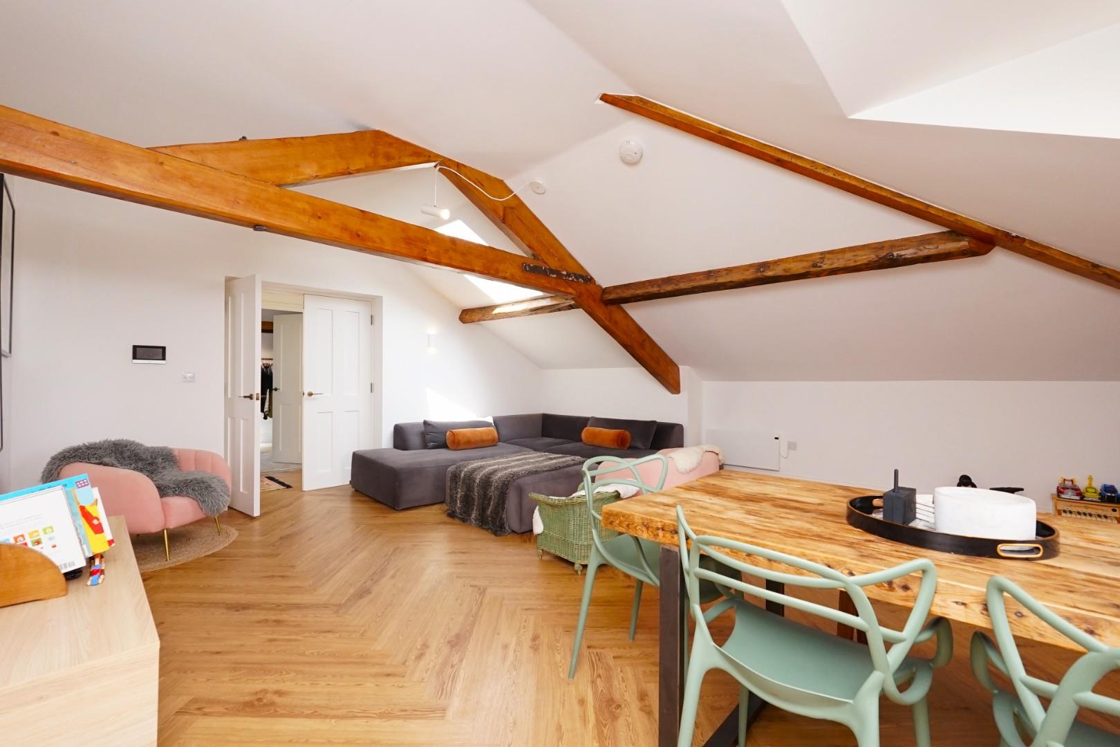 The living/dining room is exceptionally generous in size, comfortably accommodating both lounge and dining furniture, with additional space currently used as a children’s play area. A large Velux window allows for excellent natural light, complementing the attractive flooring that runs throughout. Characterful exposed ceiling beams add charm, while a large window frames delightful views over the Ulverston Canal, stretching towards Morecambe Bay.