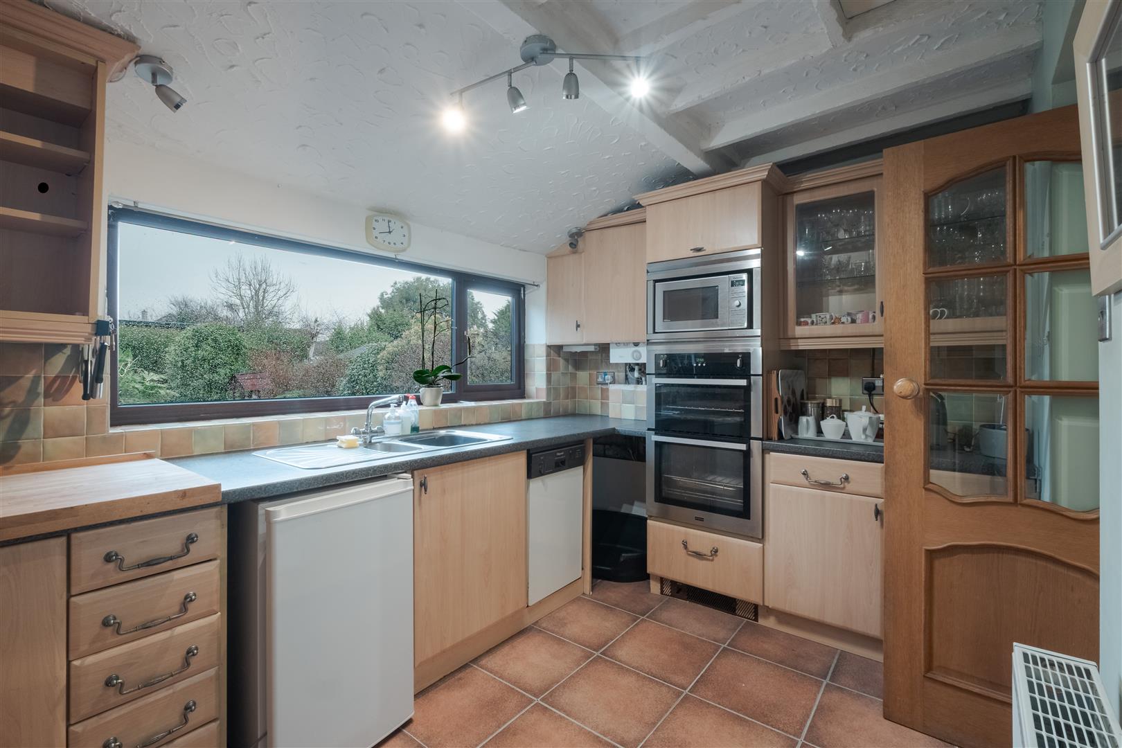 Leading on from the dining area is the kitchen, fitted with ample base and wall units, and positioned to enjoy outlooks over the rear garden. Adjacent to the kitchen is a practical utility room, offering additional storage and workspace, as well as access to a ground floor WC, adding convenience for family life. The utility area also provides internal access to the garage, ideal for storage or secure parking.