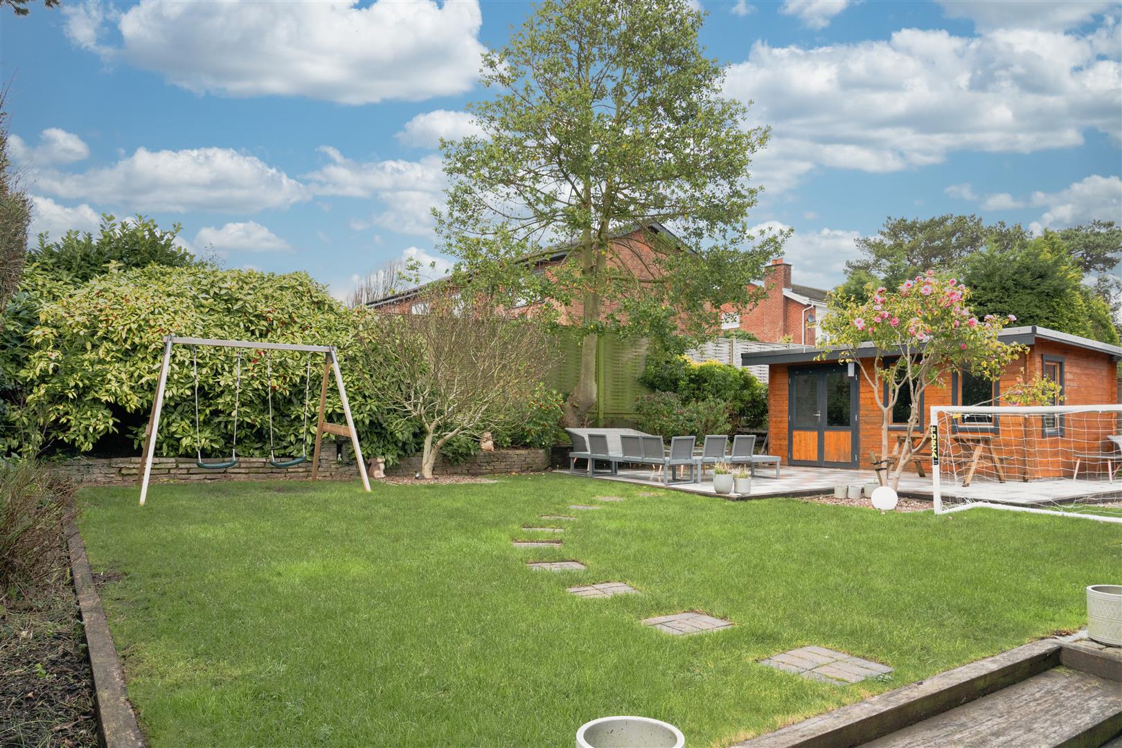 Stepping out from the house onto a generous paved patio, there is ample space for outdoor dining and seating. The patio flows seamlessly onto a well-kept lawn, offering plenty of room for children to play while still retaining a clean, landscaped feel. Mature planting and established borders add greenery and privacy, creating a pleasant and enclosed setting.