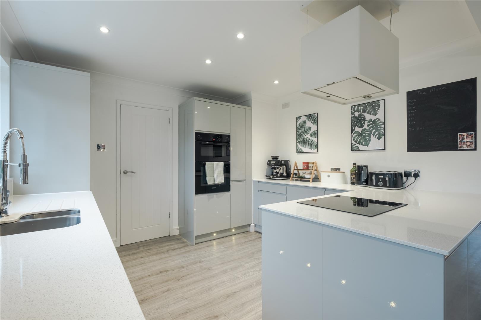 Moving through the open plan space, the kitchen sits at the heart of the home and has been thoughtfully designed with both practicality and style in mind. Gloss cabinetry in soft neutral tones is paired with crisp quartz worktops and integrated appliances such as a double oven, induction hob, dishwasher and fridge/freezer, creating a streamlined, high-end look. Subtle lighting and uncluttered surfaces enhance the bright, airy feel. The adjacent dining room offers a dedicated space for family meals, conveniently positioned beside the kitchen while retaining its own distinct area.