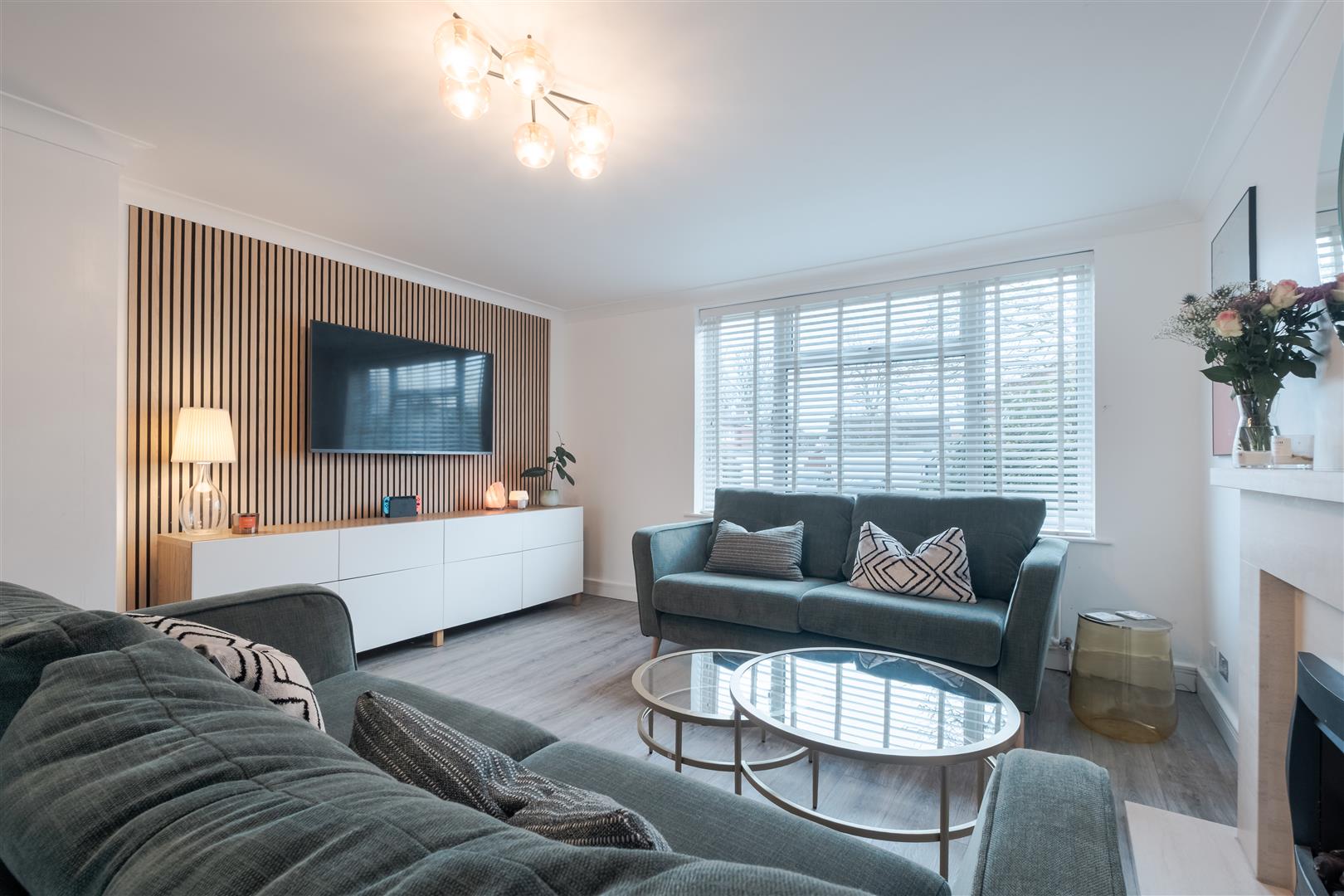 To the left, the lounge offers a beautifully presented space to relax and unwind. A large window allows natural light to pour in, enhancing the light colour palette and complimenting the sleek lvt flooring. The contemporary feature wall with vertical panelling adds warmth and texture, perfectly balancing the modern finish. With ample room for generous seating and statement lighting, this is a cosy yet refined setting for everyday living.