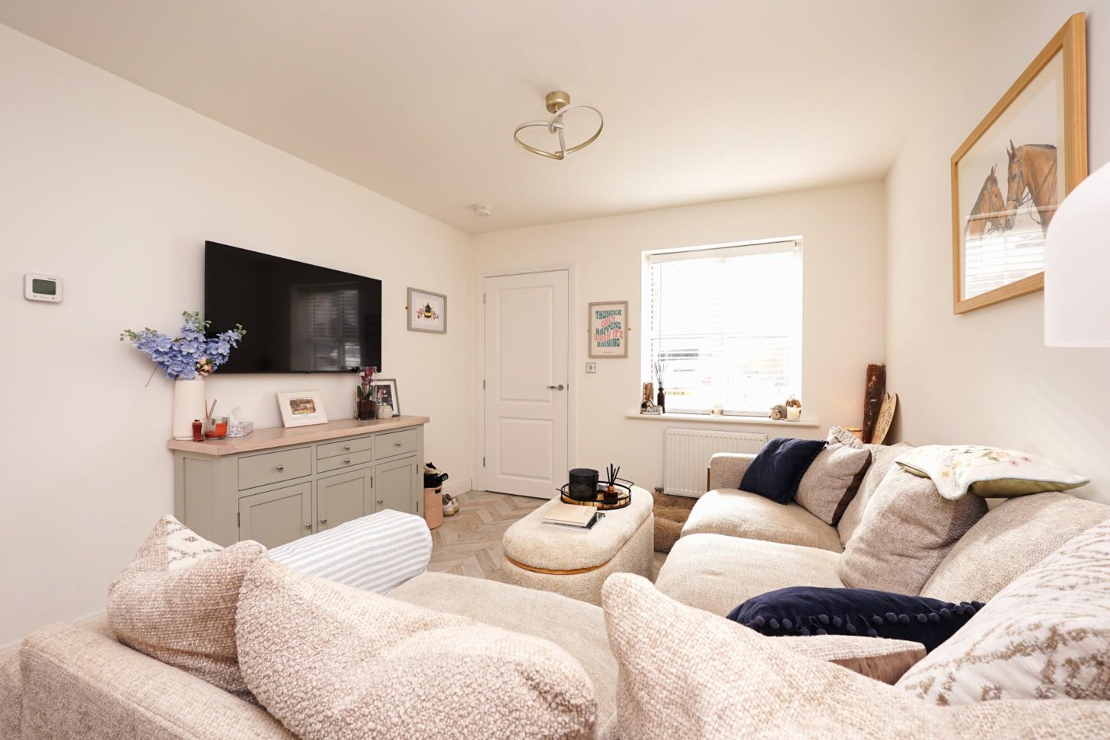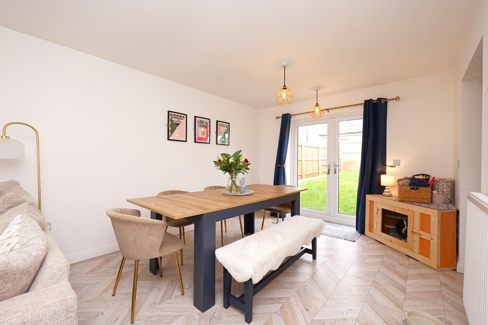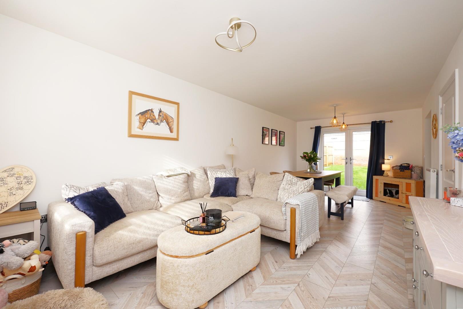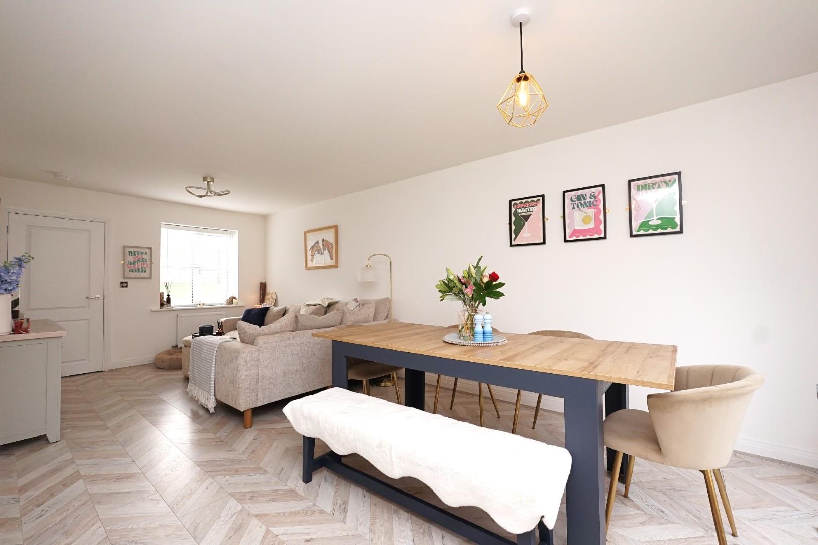 The ground floor is beautifully presented in a light, neutral décor, enhanced by herringbone wood-effect flooring that flows seamlessly throughout. The lounge/dining room enjoys plenty of natural light and features double doors opening out to the rear garden, creating an easy connection between indoor and outdoor living.