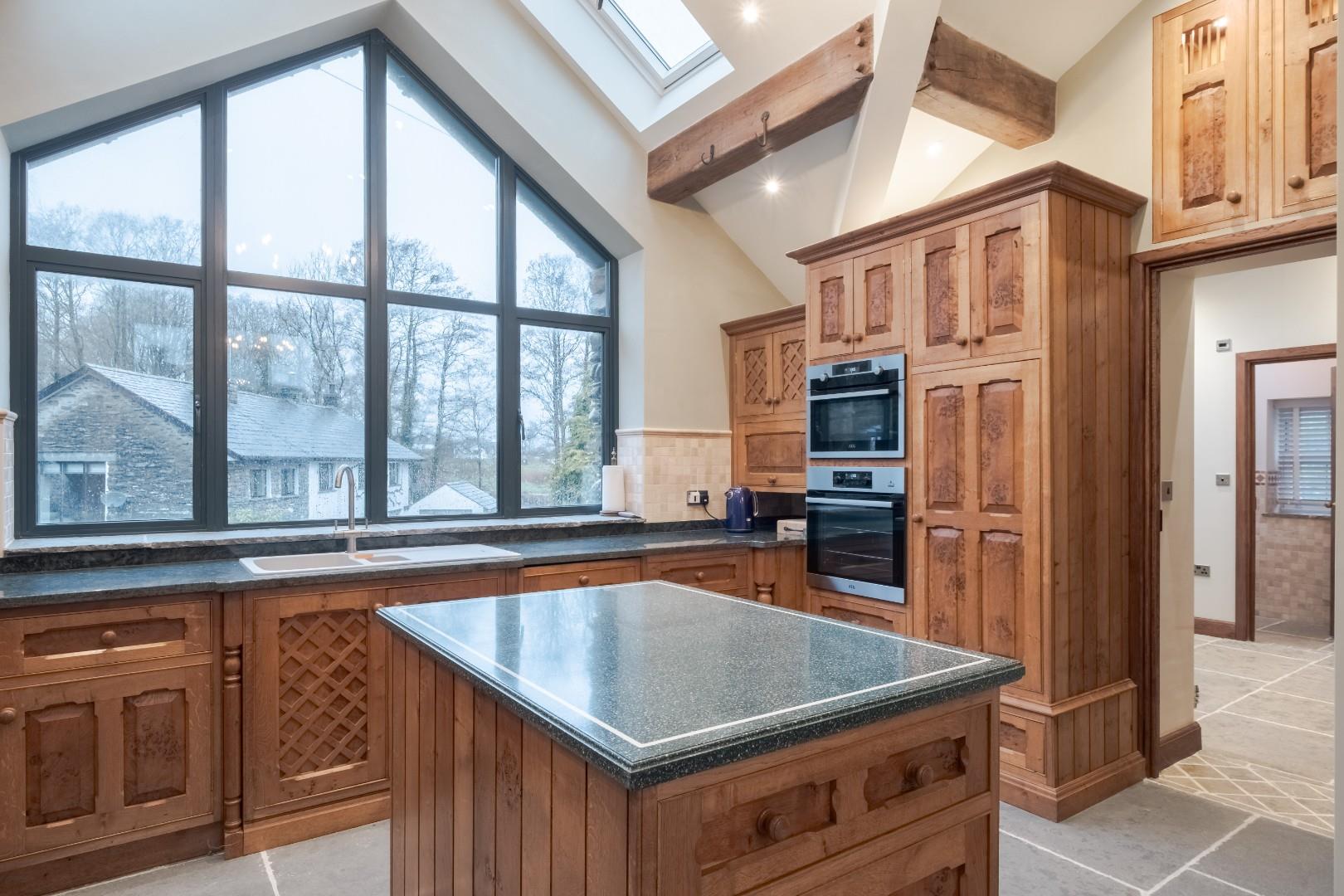 The kitchen diner is a real standout, featuring a vaulted ceiling with beams that creates a wonderful sense of volume, complemented by a stunning view window facing the rear aspect and further, the countryside. The kitchen itself is finished to a high specification, with ample workspace and a central island, making it ideal for both everyday living and entertaining. Adjacent is a practical, spacious utility room and a conveniently located WC. From here, you can access the rear aspect.