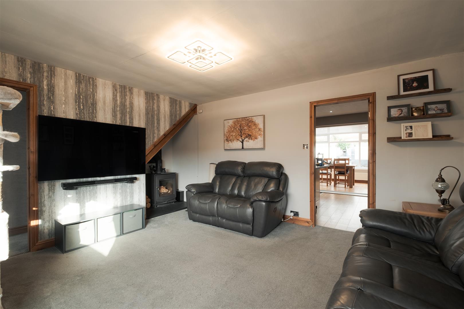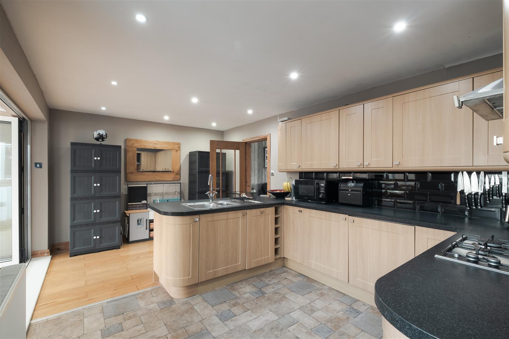 Stepping inside, the ground floor is designed with a spacious layout. The large lounge provides a comfortable area for relaxation and family time. Towards the rear, the kitchen is impressively sized, finished with traditional wooden cabinets and black worktops that offer plenty of preparation space.