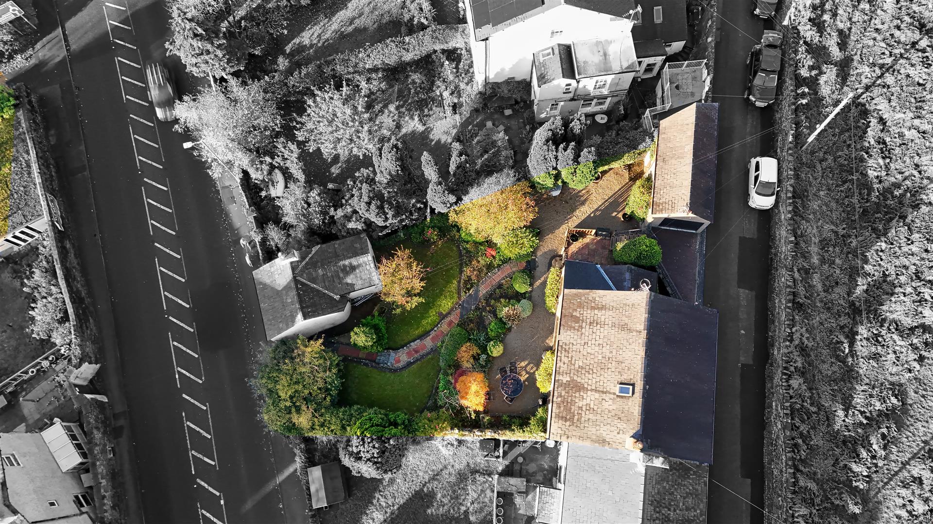 Outside, the property continues to impress with a detached garage offering storage space beneath, a private, well-sized garden featuring mature planting beds, and a driveway providing ample parking.