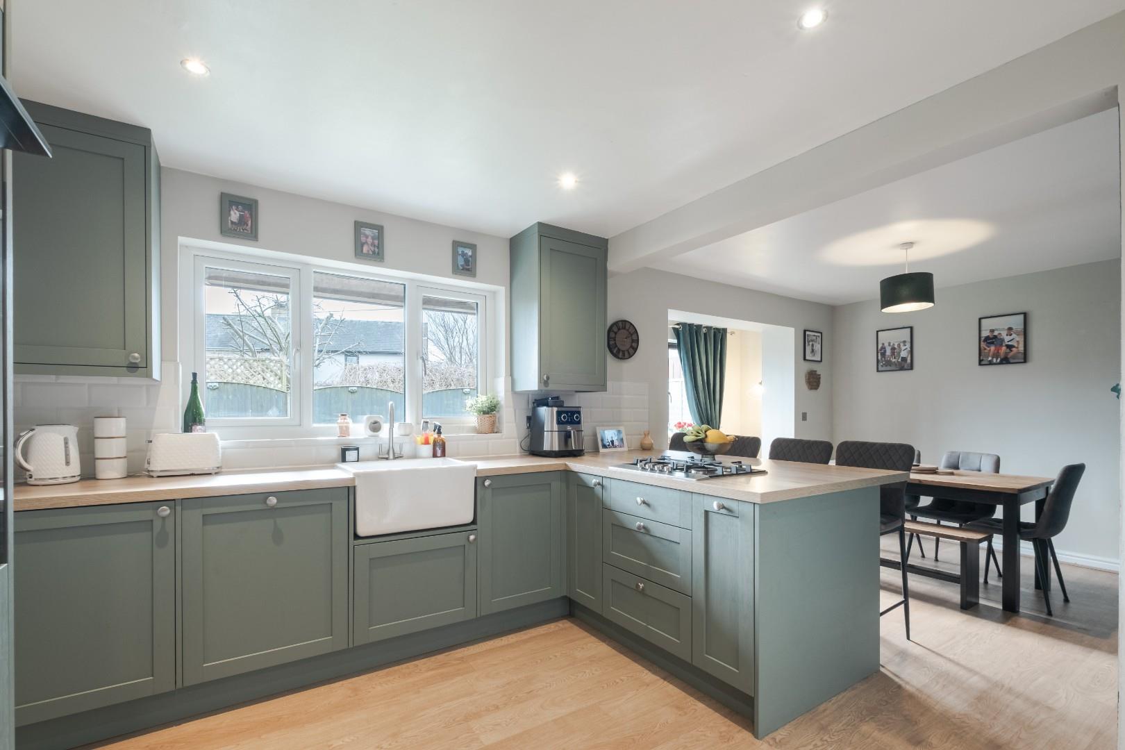 The main lounge is a generous reception room, offering a calm retreat for relaxation, with ample space for seating and soft furnishings. Flowing seamlessly from here is the true heart of the home — the stunning open-plan kitchen and dining area. Recently installed the kitchen is finished to an exceptional standard, featuring sleek contemporary cabinetry, stylish work surfaces and a comprehensive range of integrated appliances including a fridge freezer, dishwasher, washing machine, electric ovens and gas hob. Bathed in natural light through wood-style UPVC double glazed windows and doors, this space is perfectly designed for both everyday living and entertaining. A charming pantry cupboard adds character and practicality, while a side door opens directly onto the garden, effortlessly blending indoor and outdoor living.
