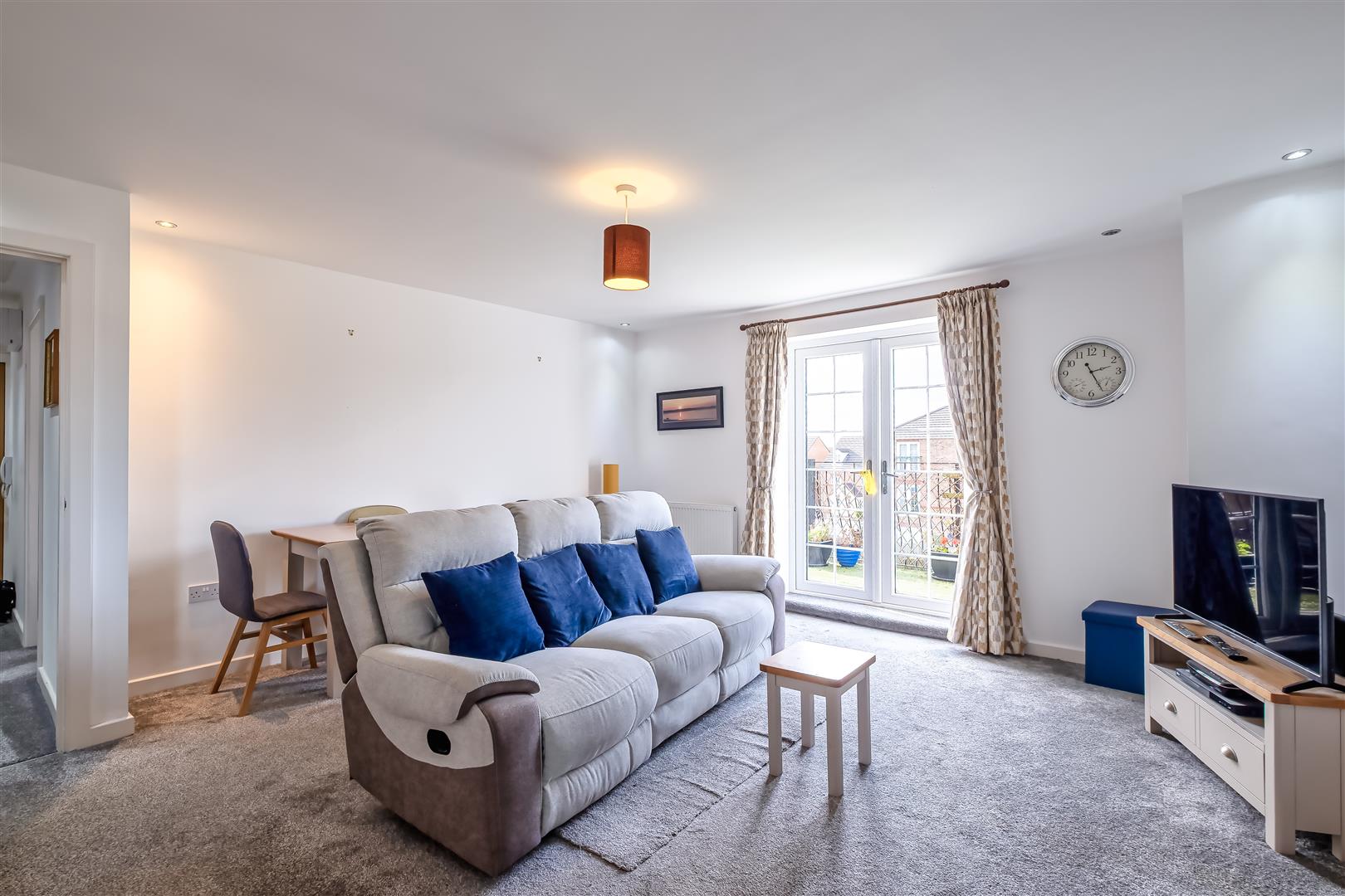 On approach you enter through a key code door, and are lead up to the top floor, via stairs or a lift, to a two bedroomed flat. As you enter, you are welcomed into cosy hallway giving access to all main areas. The hallway boasts grey carpeting flowing throughout the property. The reception room sits at the rear, and is a generous sized room, featuring french doors that lead out onto a private balcony. From here you can gain access to the kitchen which has been fitted with cream shaker style wall and base units, with laminate wood effect work surfaces, subway tiled walls and a tiled flooring, with integrated appliances such as a four ring gas hob, a stainless steel extractor fan, and a double oven, with space for free standing appliances.