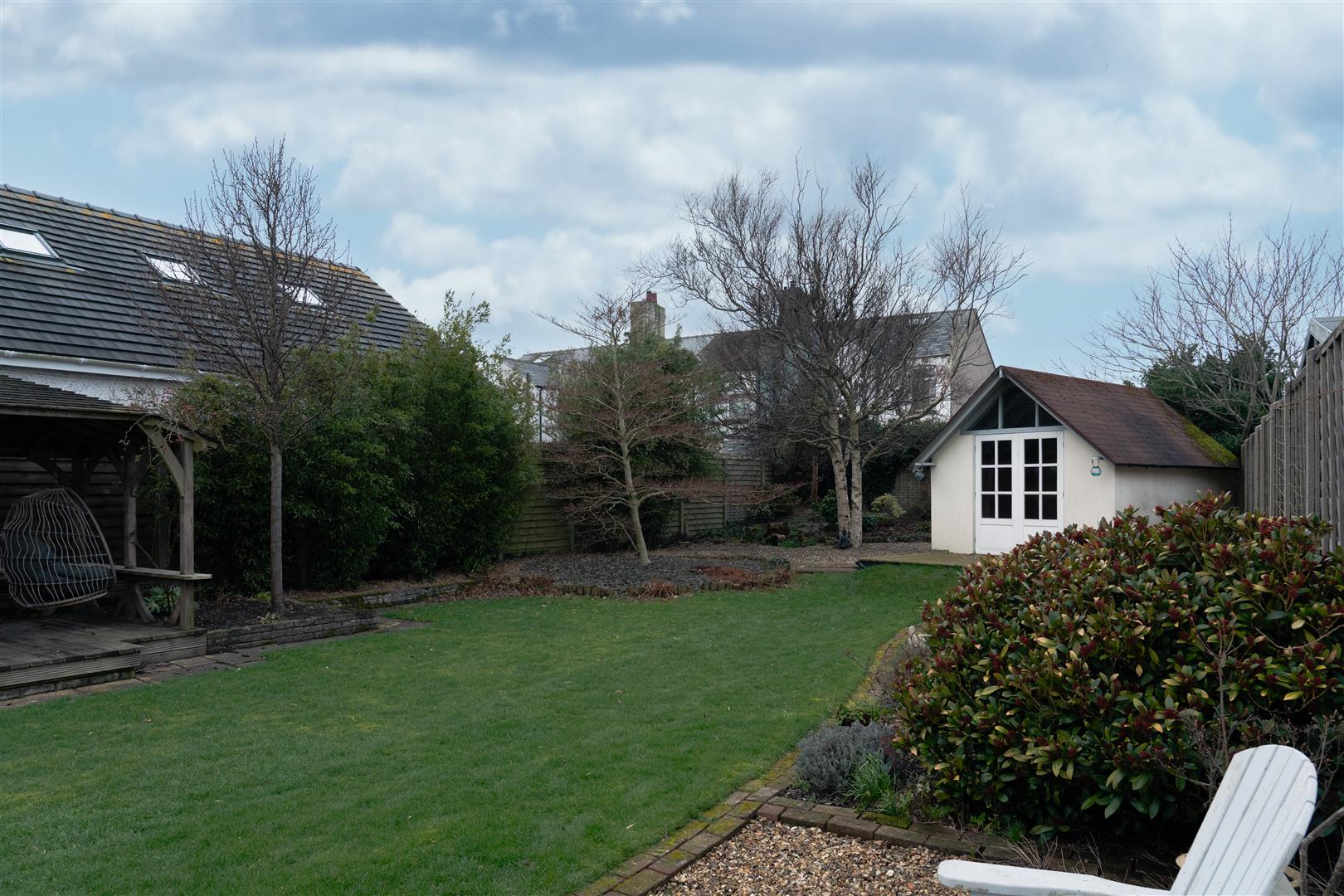 The rear garden is a real highlight of the property, offering a generous and well-designed outdoor space. A sweeping paved pathway leads through a large gravelled seating area, before opening onto a neatly maintained lawn. Mature borders and planting provide a pleasant sense of privacy, while a charming summer house sits to the rear. Externally, the property also features off-road parking, and a detached garage providing excellent storage or parking options.